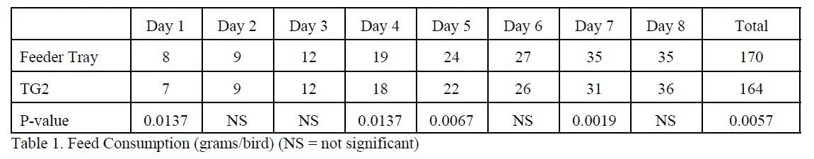 The TG2 feeders performed similarly in feed usage and had a higher feed-holding capacity when compared to the traditional chick feeder trays. Since the chicks were not standing in the feed, the TG2 feeders had no manure present. The feed usage at 6, 24 and 48 hours indicates that the chicks fed from both types of feeders found feed in a similar fashion. At the end of the first week, the chicks in the feeder tray treatment used more feed but the TG2 birds had slightly better body weights and feed conversion.