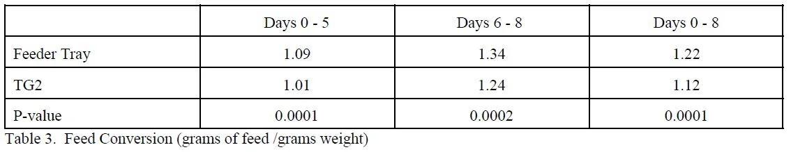 Body weights were only found to be significantly different at the end of the study with the TG2 birds weighing 6 grams heavier than feeder tray birds (Table 2). No significant differences were noted in body weight uniformity at the end of the trial with feeder tray=9.4% and TG2=10.1%. The feed conversion for periods 0 to 5 days, 6 to 8 days, as well as 0 to 8 days were significantly lower in the TG2 treatment (Table 3).